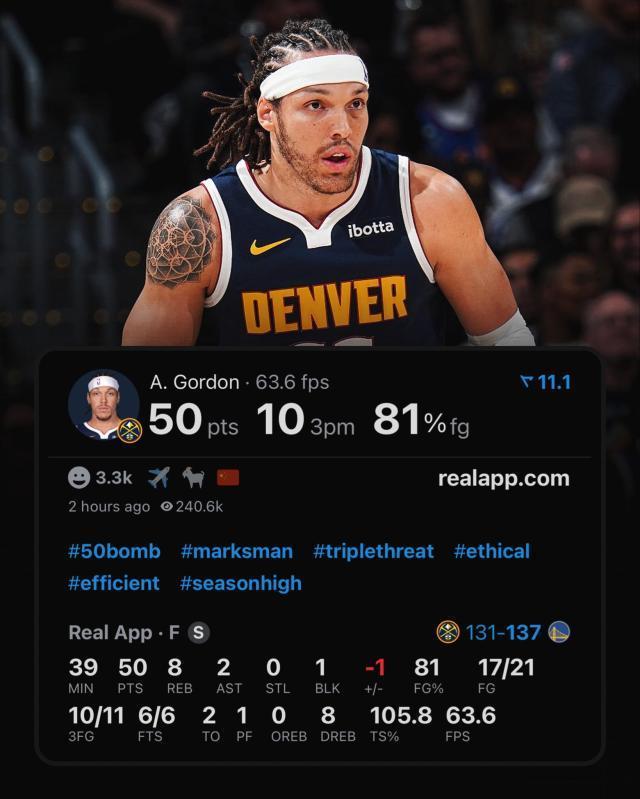 北京时间10月24日,掘金迎来赛季揭幕战,他们客场挑战金州勇士。经历了一个加时赛的苦战,戈登拿到了创职业生涯纪录的50分(此前最高41分),他在三分线外的准星令人惊叹,上半场就7投7中,追平了NBA历史半场三分全中的命中纪录。最终全场打完,戈登的真实命中率为105.8%,超越凯瑞·欧文,成为了NBA历史单场真实命中率最高的50分先生。